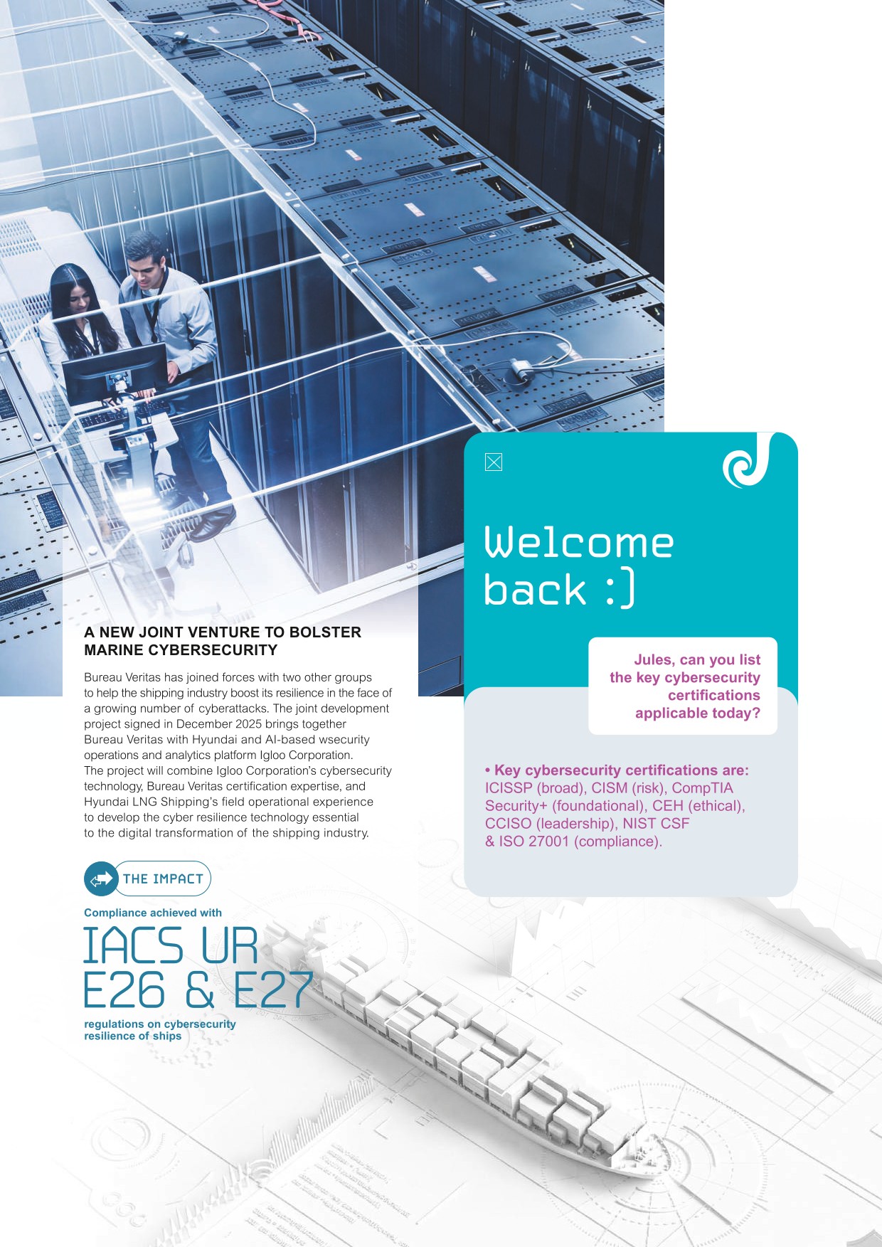 - ●Cyber resilience: the International Association of Classification Societies (IACS) unified requirement sets out classification rules for the cyber resilience of ships and of on-board systems and equipment. A revised version of the unified requirement came into force in July 2024.