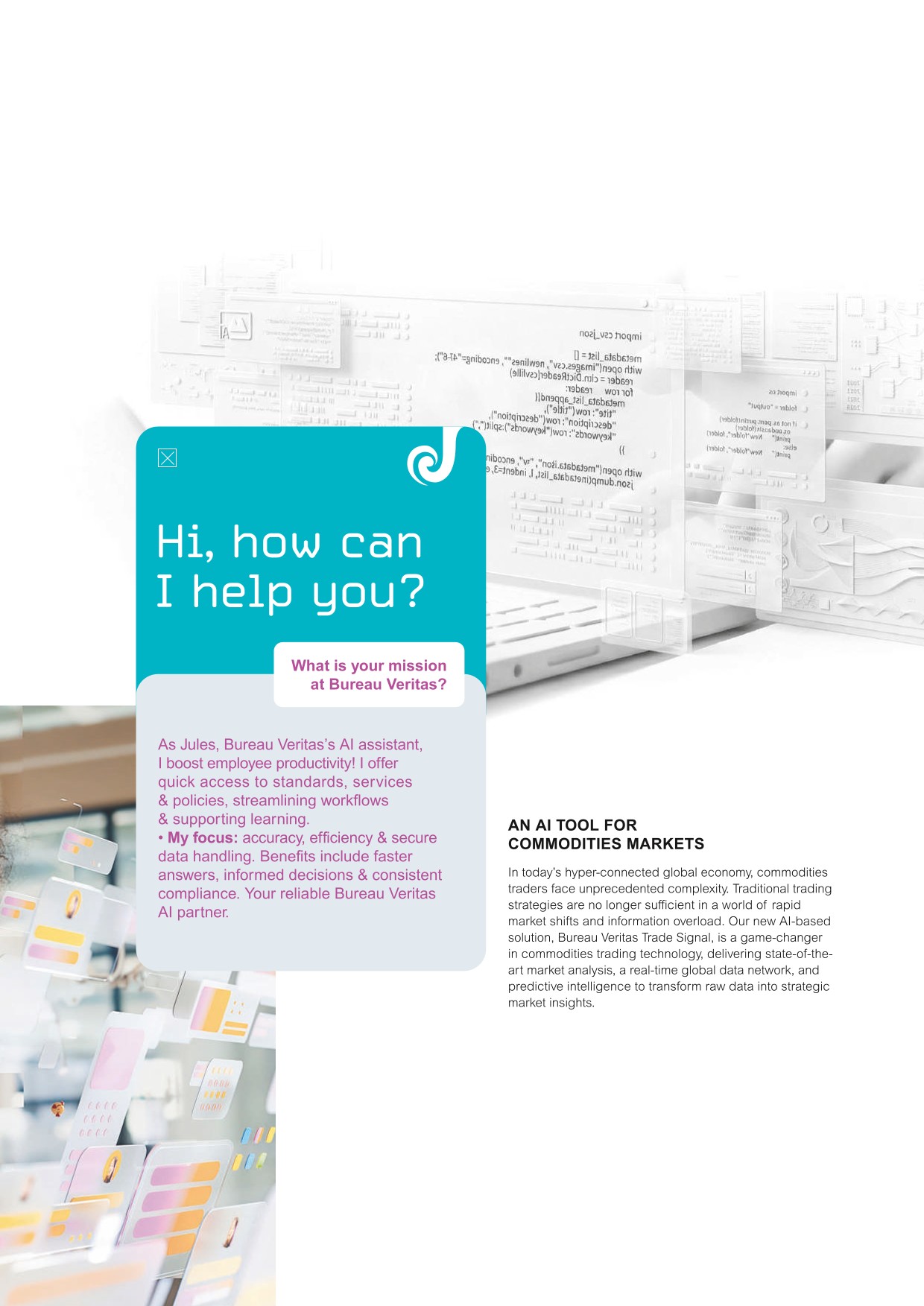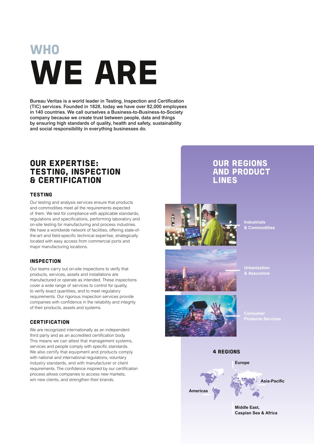 Bureau Veritas is a world leader in Testing, Inspection and Certification (TIC) services. The Group helps strengthen trust between companies, authorities and consumers. Its mission is to reduce its clients' risks and improve their performances. It also supports its clients with their innovations in the areas of quality, health, safety and sustainable development.