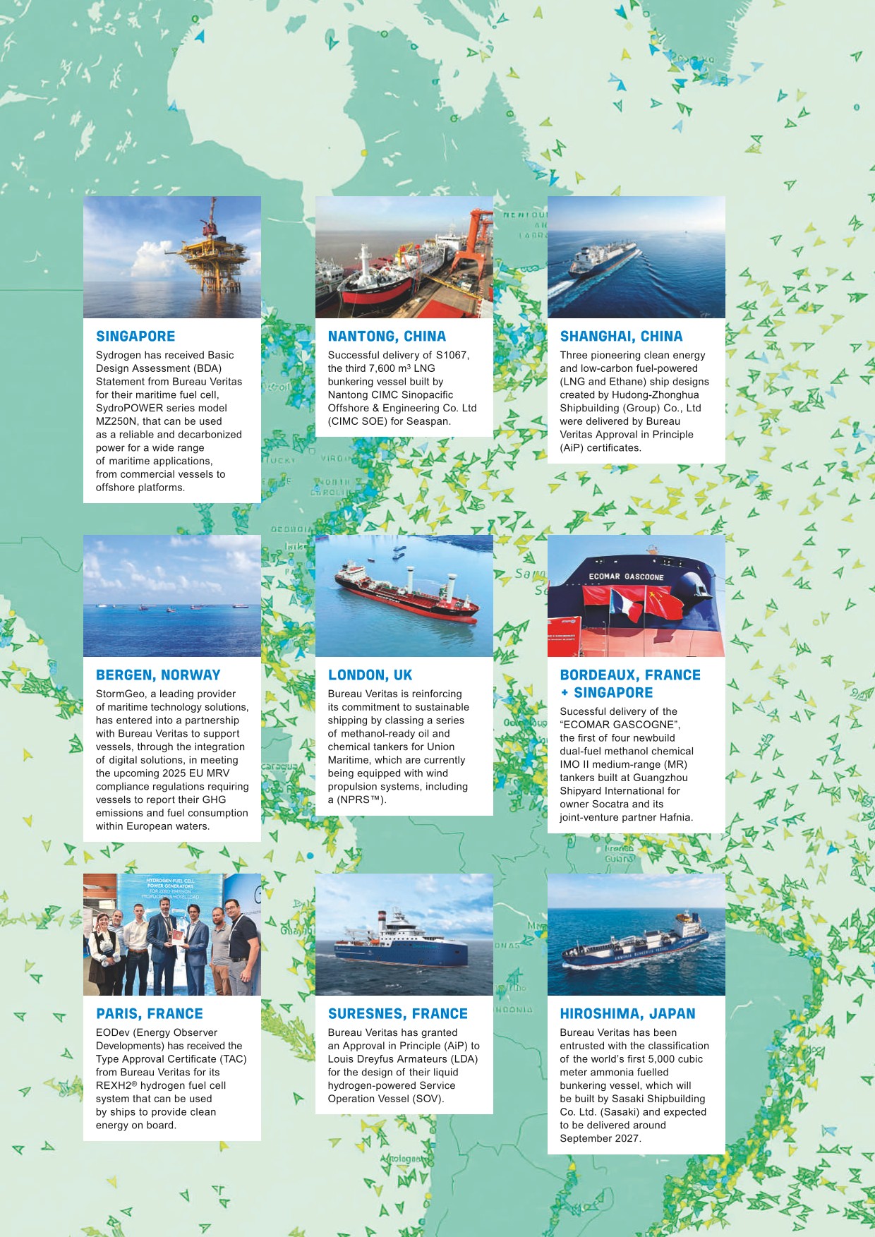 - ●The EU's "Fit for 55" package: these measures set out a roadmap for achieving the European Union's goal of reducing GHG emissions in the EU by at least 55% by 2030 as part of the European green deal. Bureau Veritas offers audit, inspection and certification services to help maritime companies comply with new requirements applicable as from 2024 and 2025.